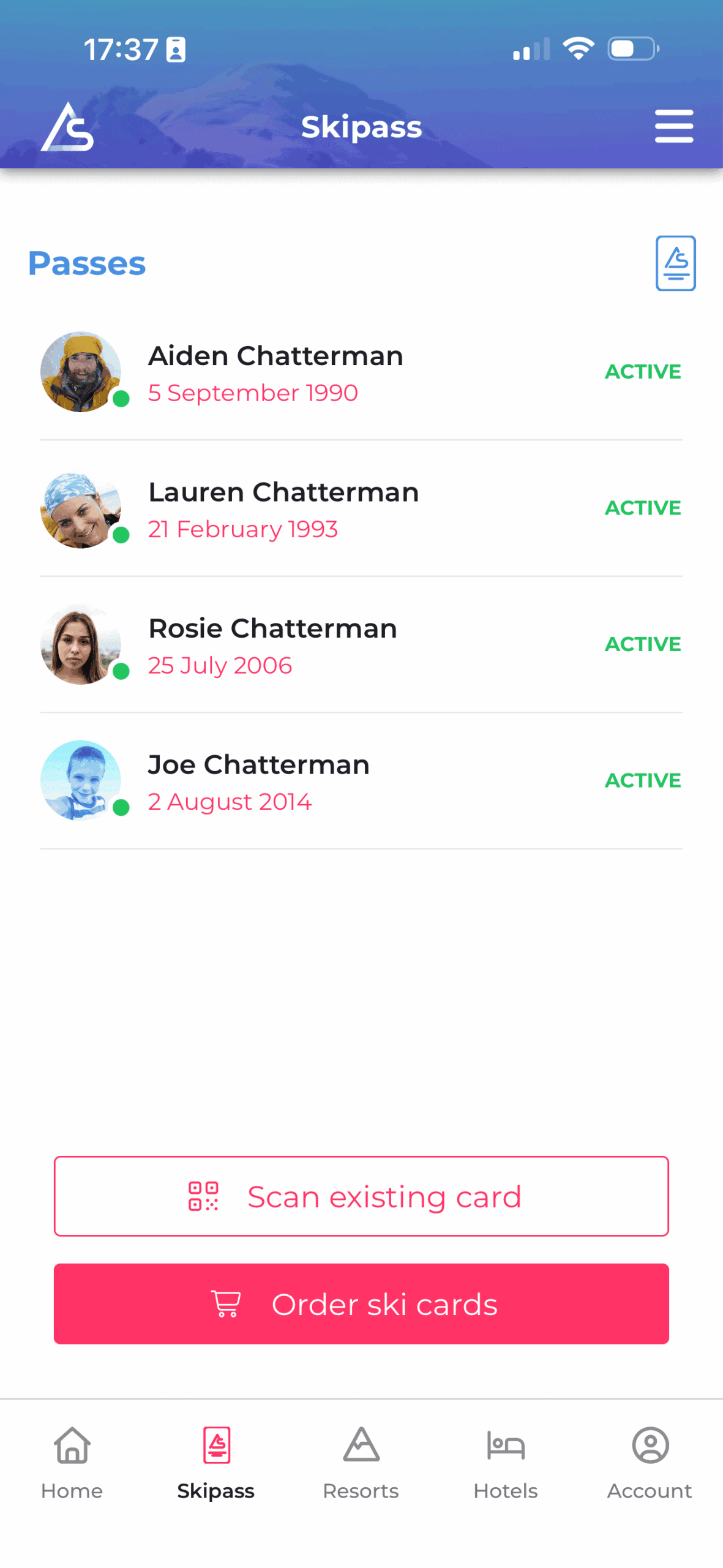 - Es dauert nur wenige Sekunden. Fügen Sie den Namen und das Geburtsdatum des Skifahrers hinzu, damit wir die richtige Skipass-Kategorie anwenden können. Sie können jetzt oder später ein Foto hinzufügen. Aktualisieren Sie durch Herunterziehen und prüfen Sie, dass der Status ‚Aktiv‘ angezeigt wird. Wiederholen Sie dies für jedes Familienmitglied. Sobald alle aktiviert sind, können Sie direkt auf die Pisten gehen.rnrn