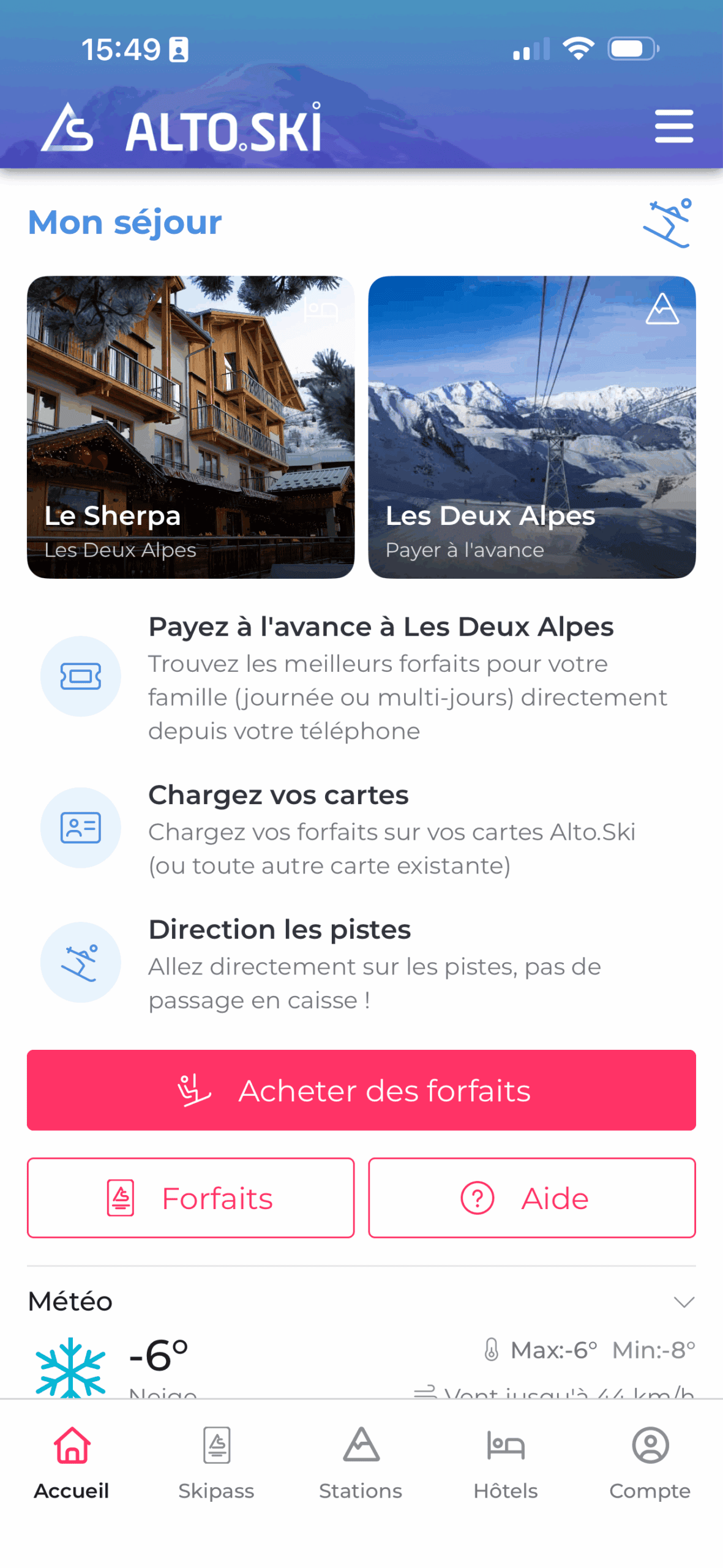 - Choisissez votre hôtel lors de l’inscription pour qu’il apparaisse sur votre écran d’accueil. Ajoutez un moyen de paiement. Activez votre carte de ski (existante ou récupérée à l’hôtel), sélectionnez votre billet et skieur(s), puis passez à la caisse — votre forfait est automatiquement chargé sur la carte et vous pouvez aller directement sur les pistes.