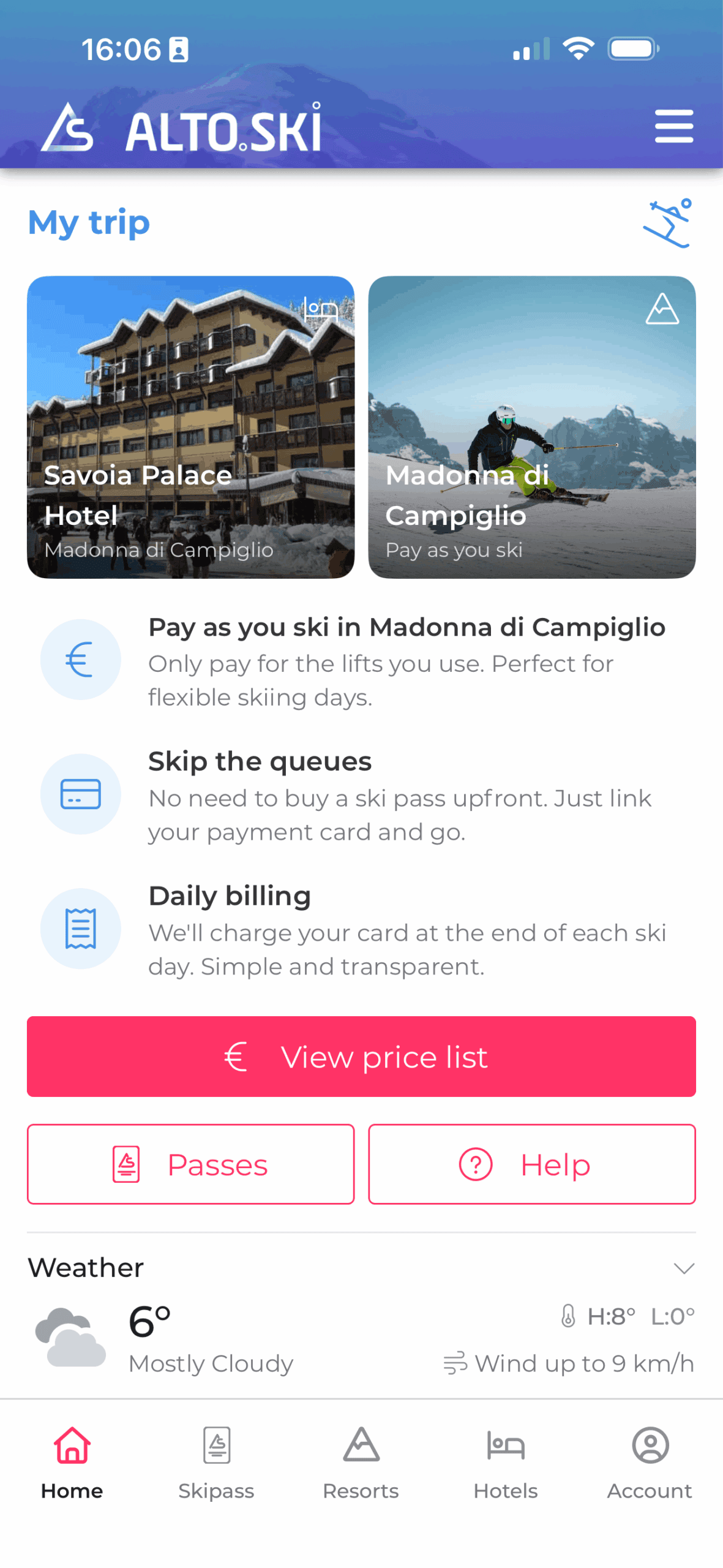 Lors de votre séjour à Savoia Palace Hotel, profitez des avantages du ski ‘pay as you go’ à Madonna di Campiglio. Tout est géré directement sur votre téléphone avec Alto.Ski — pas de files d’attente au guichet, et tout cela depuis le confort de votre hôtel.