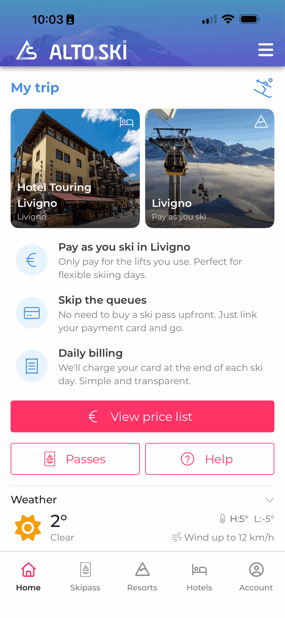 - During the quick registration, select your hotel from the list and it will appear on your home screen alongside the ski resort, giving you easy access to all the relevant information. If you plan to ski with Alto.Ski, add your payment card, It will be used for lift passes and other services which will be available through the app (ski hire, ski school etc).