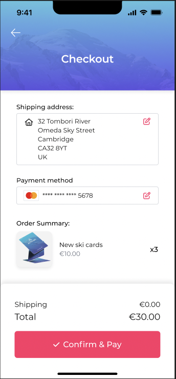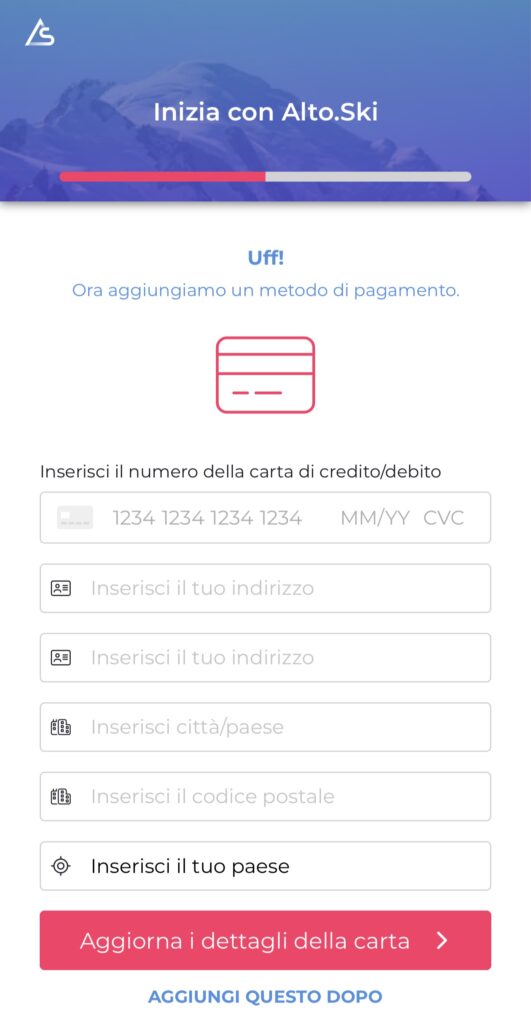 ❄️ Dopo aver inserito i dati delle ski card bisogna fare il checkout e inserire l’indirizzo al quale verranno inviate le ski cards che ha ordinato. Premere il bottone rosso per proseguire: