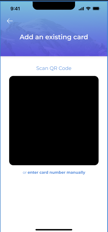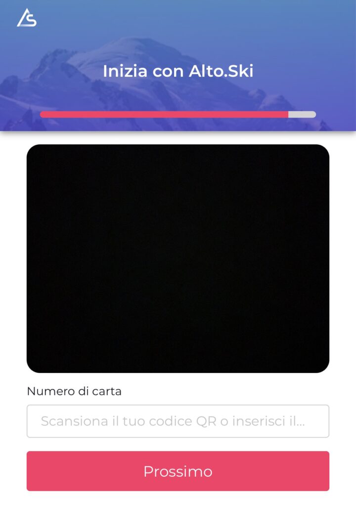 ❄️ Quando a ricevuto le ski carda casa bisogna collegarle com’app premendo“Scan QR code” e semplicemente scanerizzare il QR codice che si trova sulla ski card Alto.Ski. In alternativa può anche attivare la skicard inserendo il numero della ski card manualmente presente sulla ski card Alto.Ski o Skidata (acquistata nel comprensorio sciistico), premendo “entra il numero manualmente”: