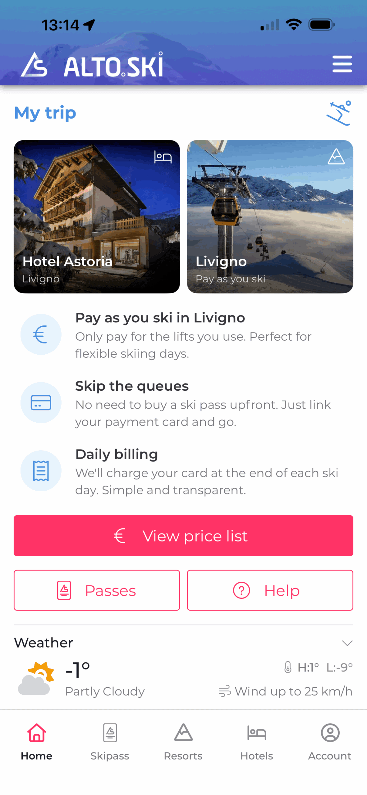 Durante il tuo soggiorno presso Hotel Astoria, puoi godere dei benefici dello sci ‘pay as you go’ a Livigno. Tutto gestito direttamente sul tuo telefono con Alto.Ski — niente code alla biglietteria, tutto dal comfort del tuo hotel.