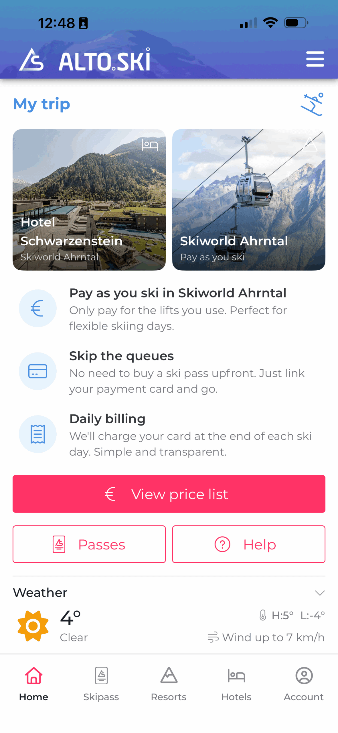 - Scarica l’app Alto.Ski dall’App Store o da Google Play. L’app è gratuita, senza abbonamento né costi fissi.